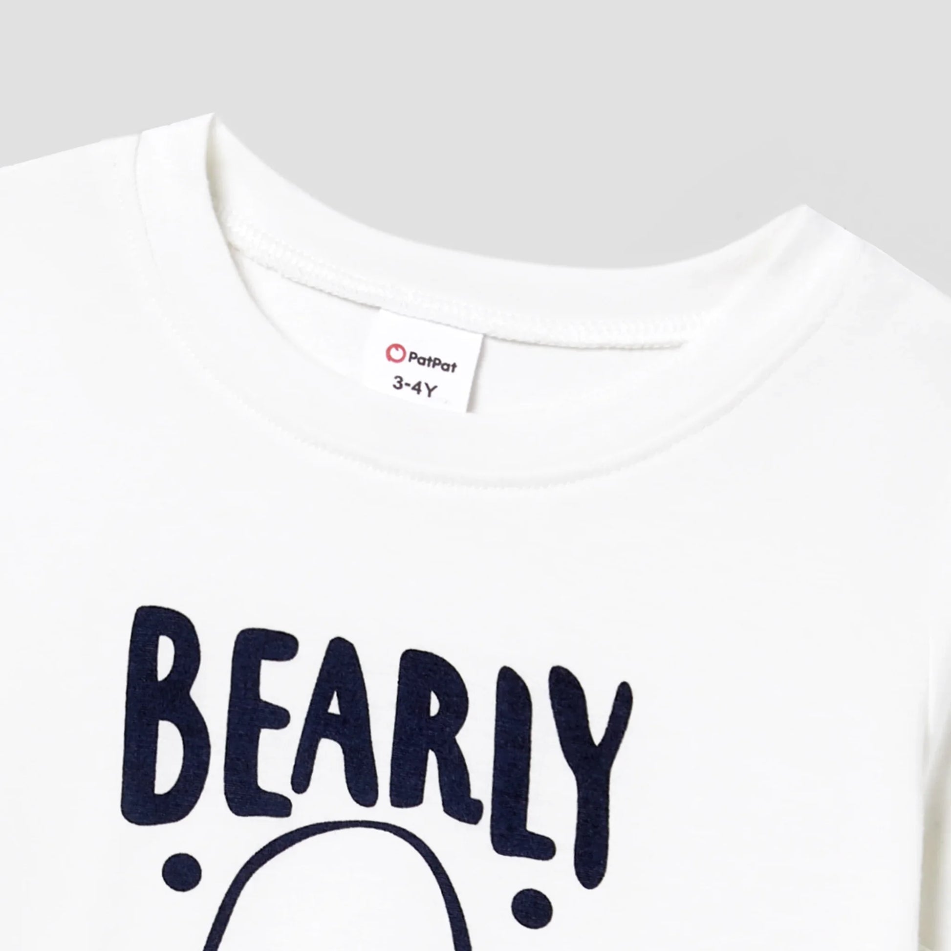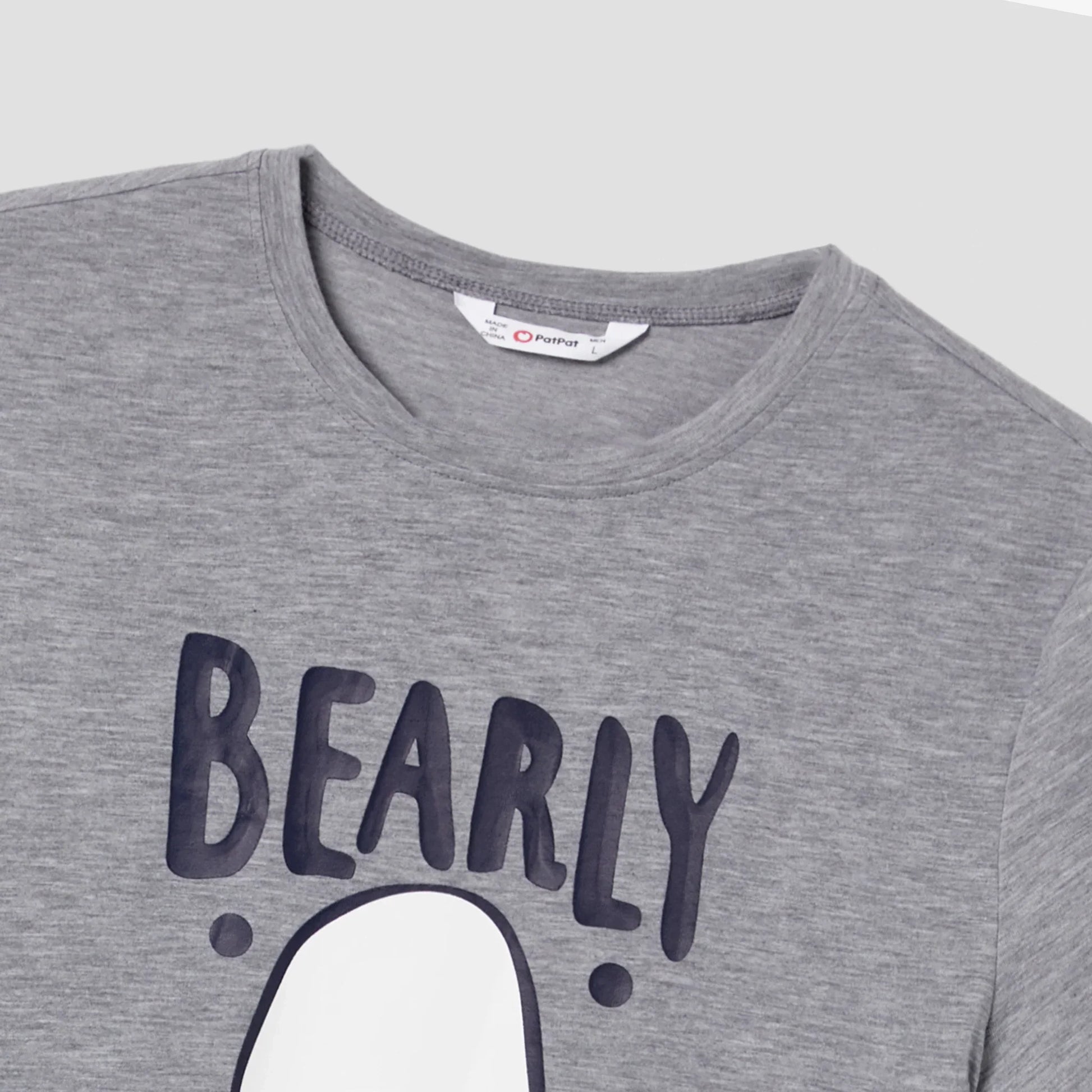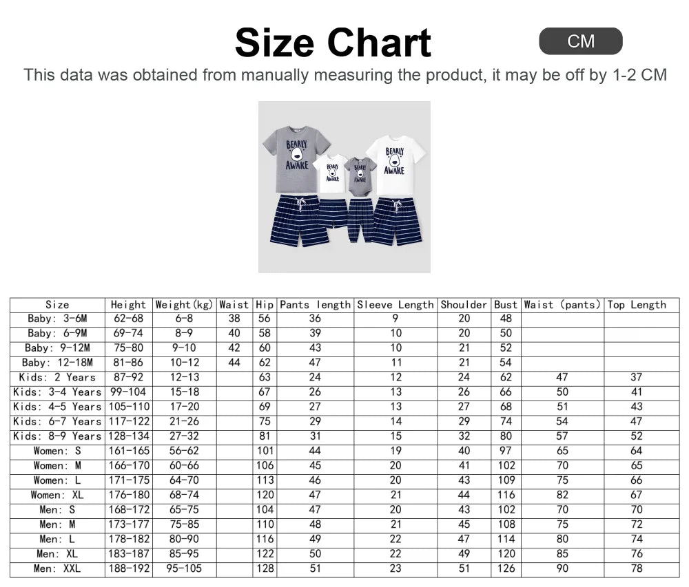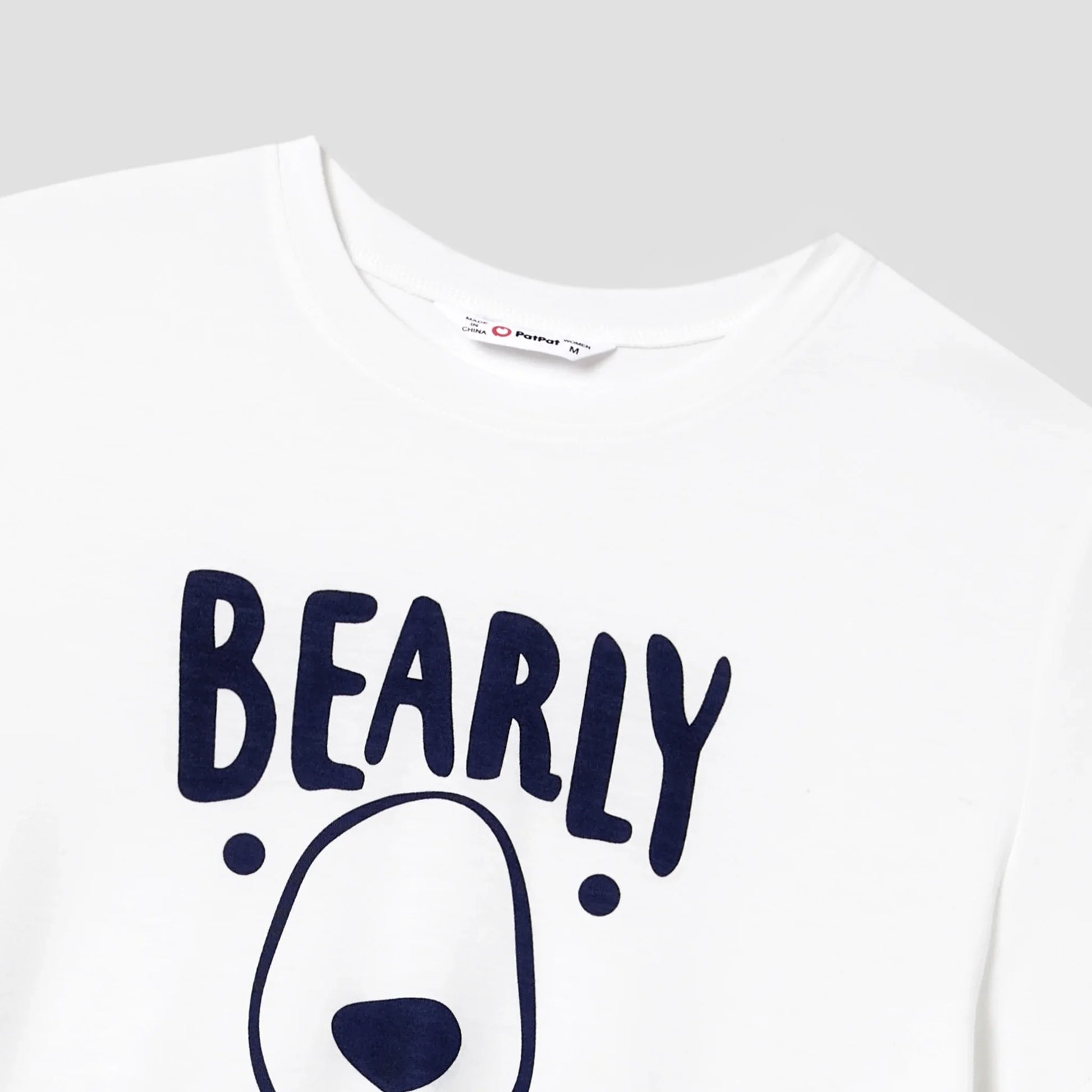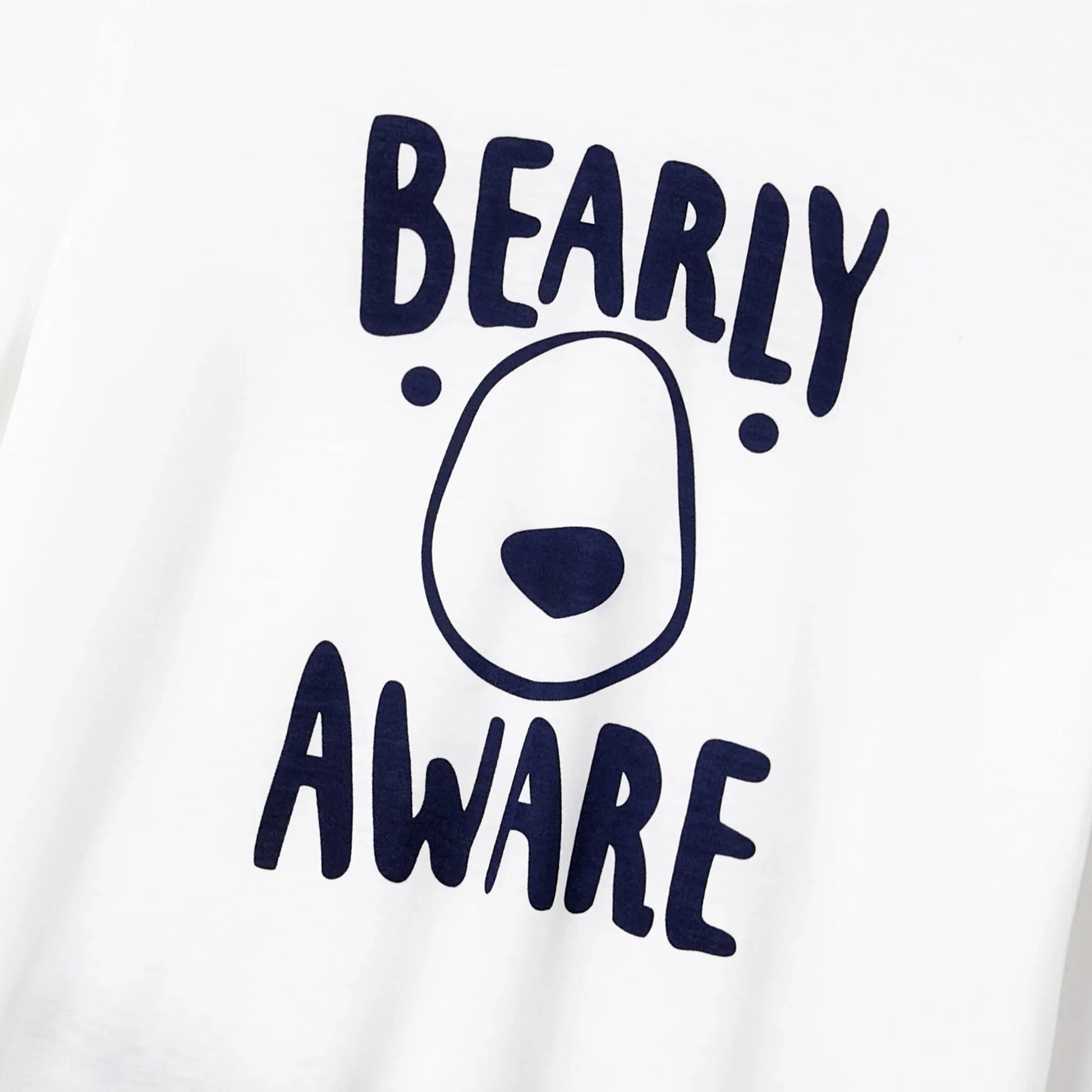La parte superior lleva las palabras "BEARLY AWAKE" en las mangas cortas, con adorables caras de oso. La mamá y el niño son osos polares, mientras que el papá y el bebé son osos pardos. Los pantalones de pijama tienen un lazo ajustable en la cintura y un diseño a rayas. Conjuntos a juego con la cara de un oso para familias.