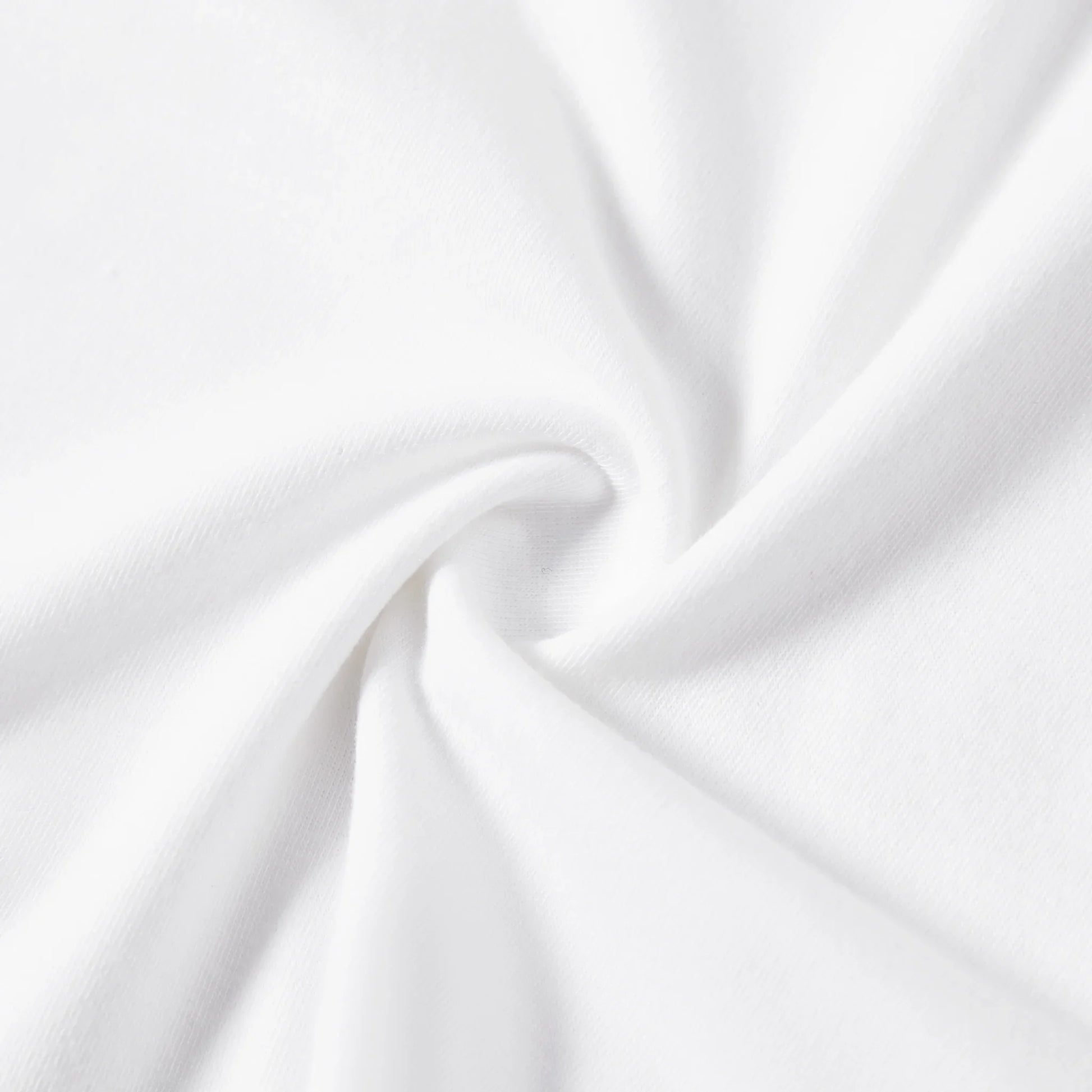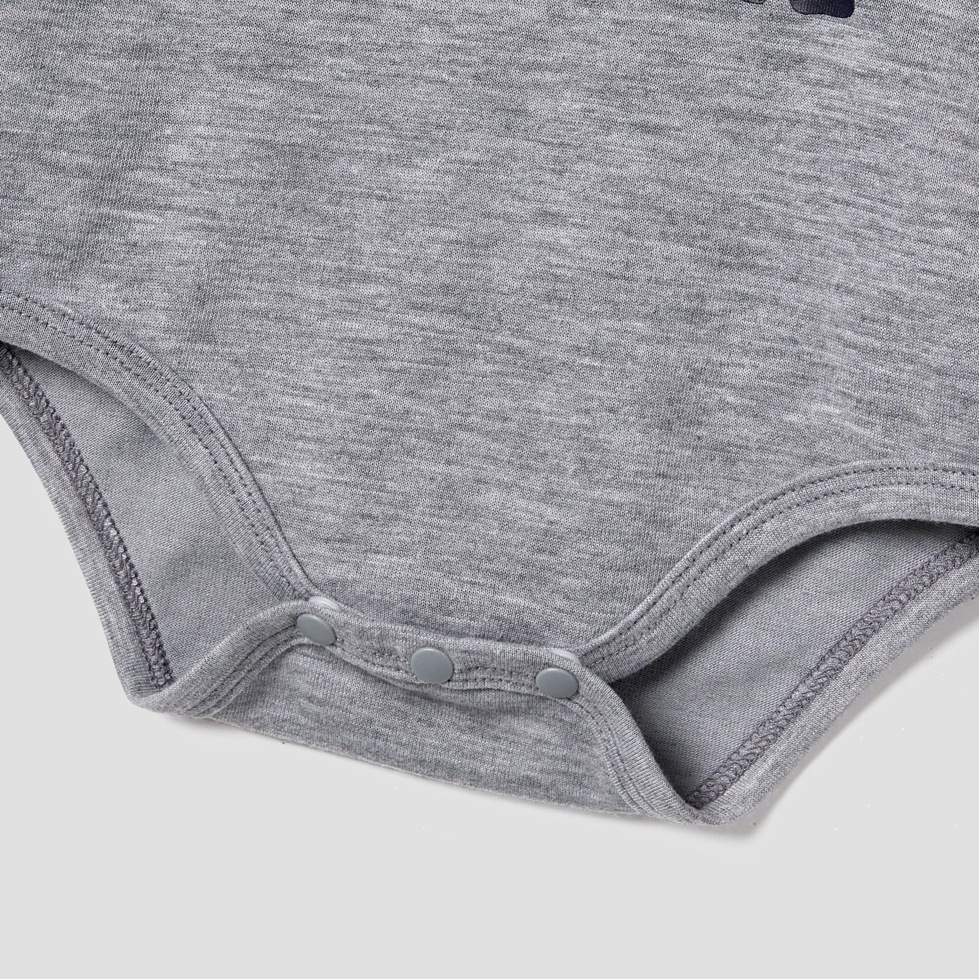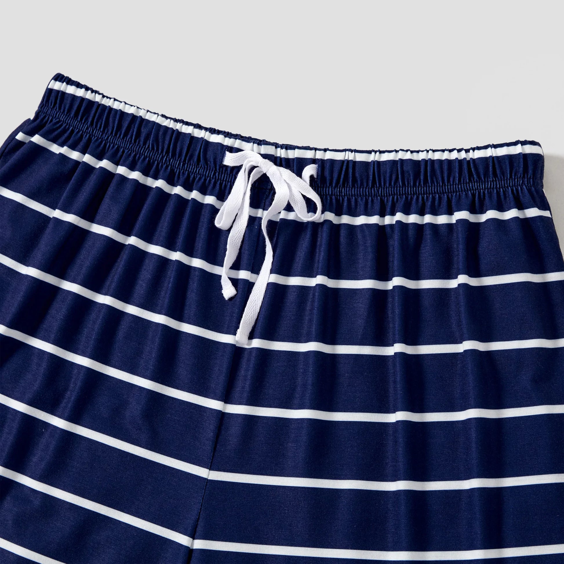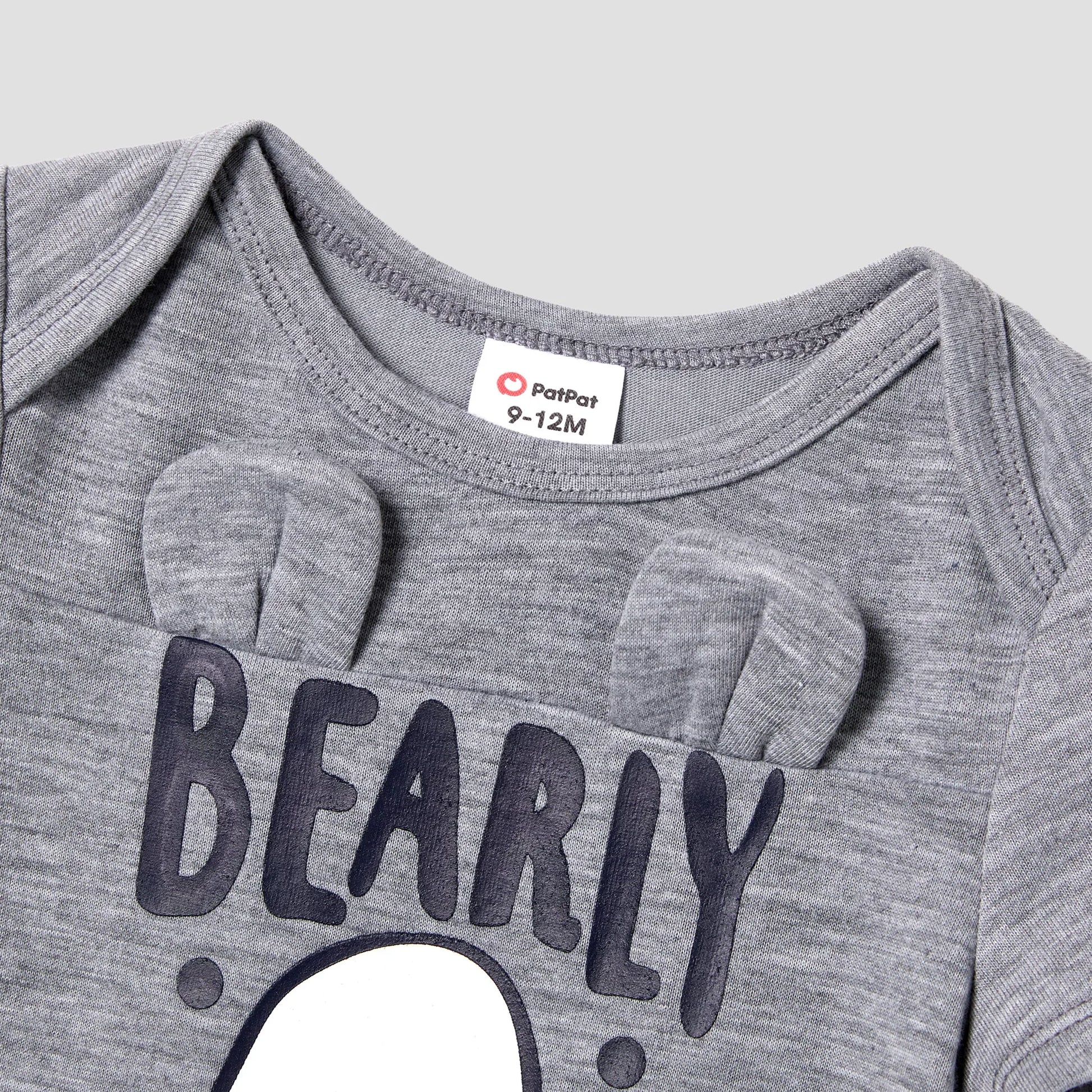 La parte superior lleva las palabras "BEARLY AWAKE" en las mangas cortas, con adorables caras de oso. La mamá y el niño son osos polares, mientras que el papá y el bebé son osos pardos. Los pantalones de pijama tienen un lazo ajustable en la cintura y un diseño a rayas. Conjuntos a juego con la cara de un oso para familias.