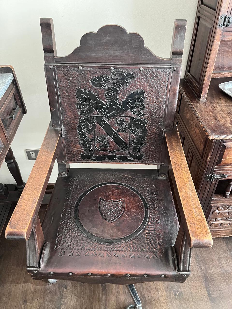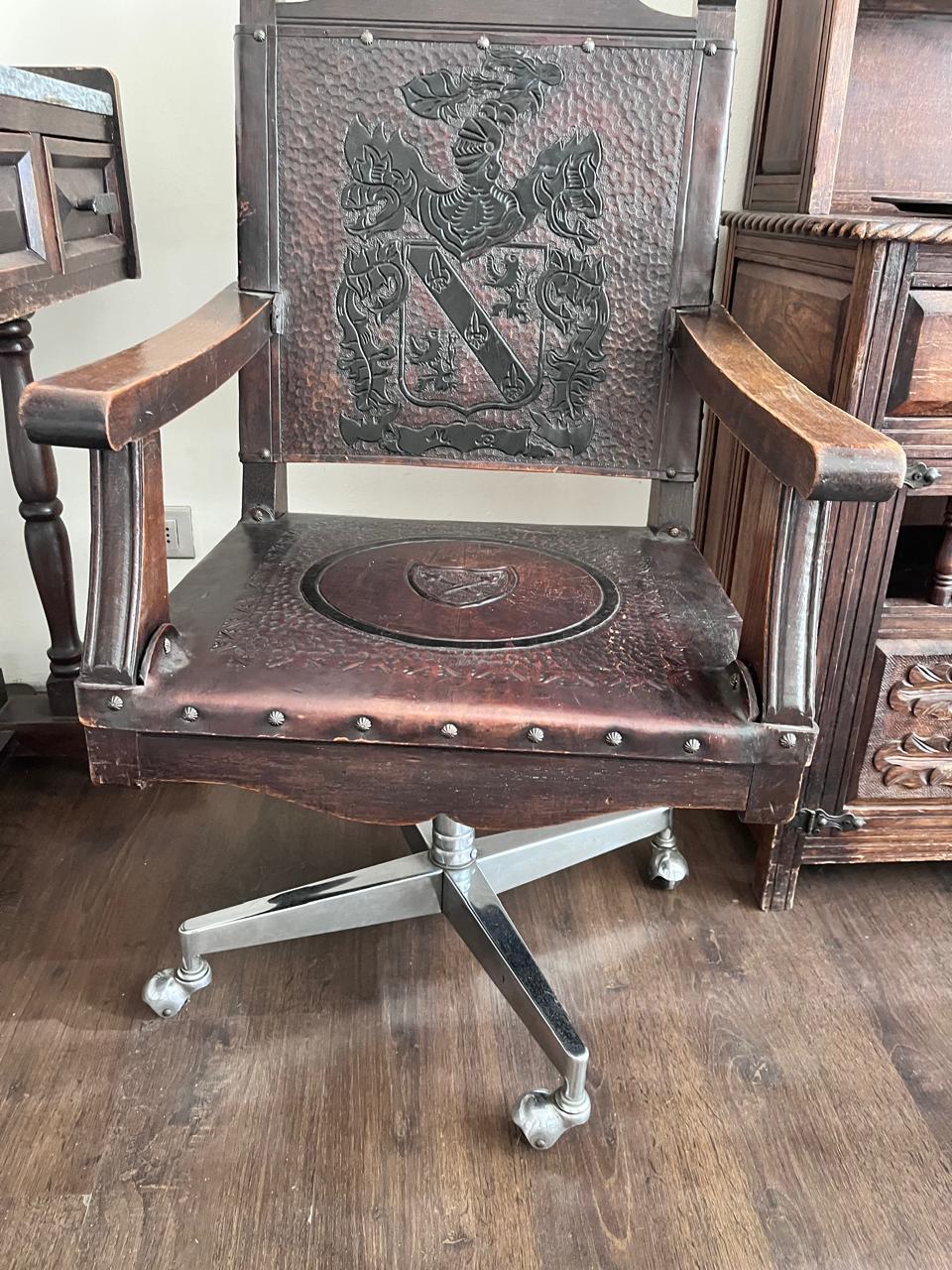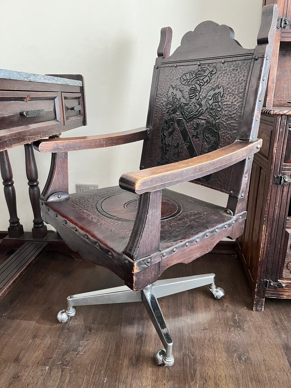 Elegante silla de escritorio con estructura de madera maciza oscura y detalles en cuero repujado artesanal, que incluye un escudo heráldico grabado en el respaldo y diseño circular en el asiento. La base metálica con ruedas le da un toque moderno y funcional, perfecta para espacios de trabajo con estilo clásico o vintage.