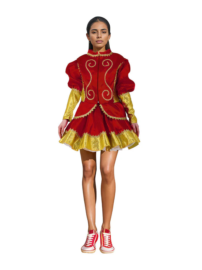 Disponible en rojo, negro, azul y blanco, este atuendo ofrece un look elegante y vibrante que resalta la tradición y el dinamismo de la danza caporal.