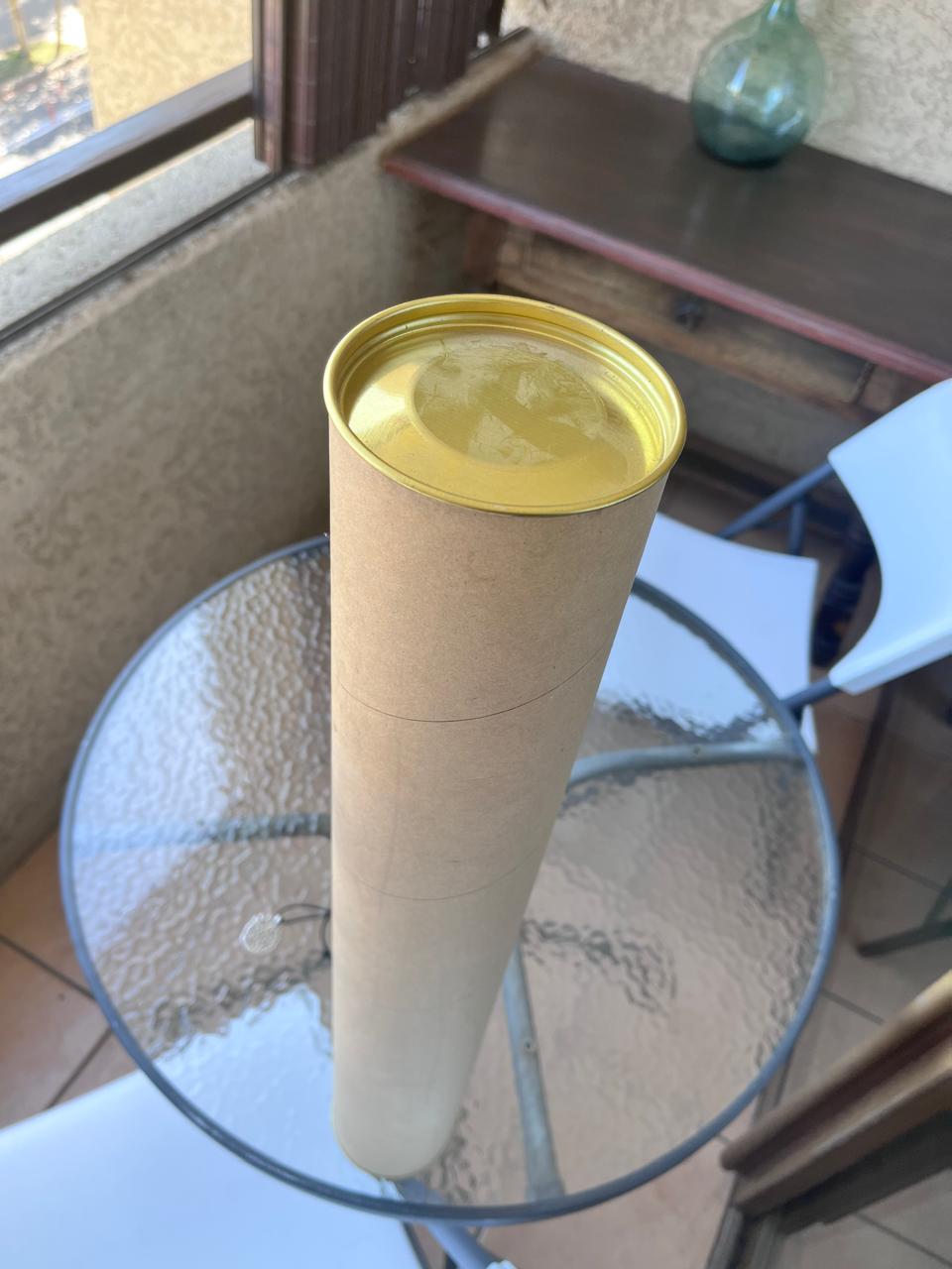 Tubo cilíndrico de cartón kraft con tapa metálica dorada, ideal para proteger y transportar afiches, planos, ilustraciones o documentos enrollados. Su diseño minimalista y firme estructura lo convierten en una excelente opción tanto para embalaje como para presentación de productos.